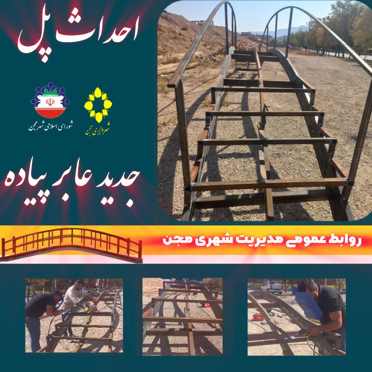 به گزارش روابط عمومی مدیریت شهری ، شهرداری مجن در ادامه عملیات ساخت و نصب و جایگزینی پل های عابر پیاده کار ساخت پل جدید جهت نصب بر روی رودخانه های سطح شهر و درراستای تسهیل عبور و مرور و ایمن سازی مسیر رودخانهها آغاز نمود.